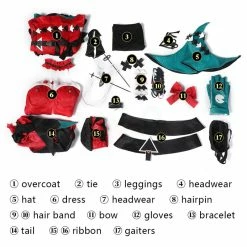 Full Set Including : Overcoat, Tie, Leggings, Headwear, Hat, Dress, Hairpin, Hair Band, Bow, Gloves, Bracelet, Tail, Ribbon, Gaiters.