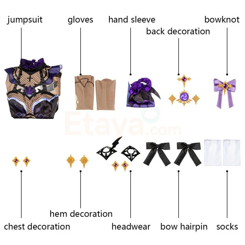 Full Set Including : Jumpsuit, Gloves, Sleeves, Headwear, Socks, Bow Hairpins, Back Decoration, Chest Decoration, Other Decorations.