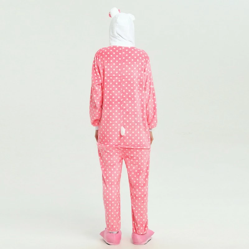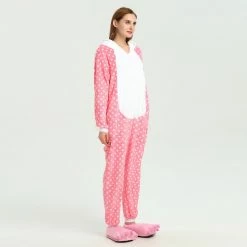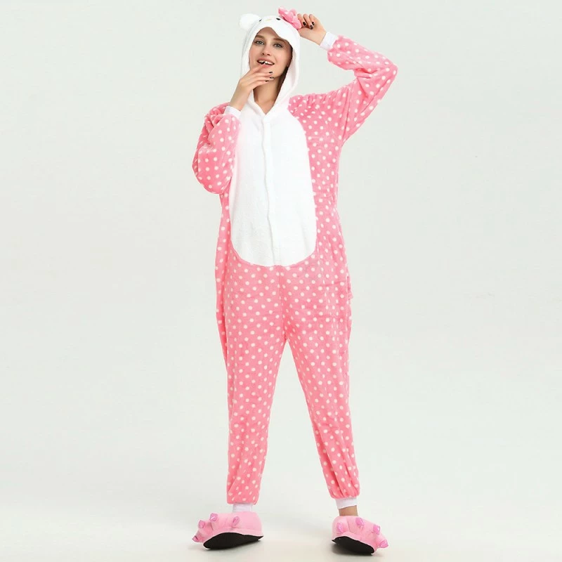 You will be kept warm by this soft fleece while Hello Kitty stands out with her traditional red Bow! High quality. Soft and comfortable. The charming Hello Kitty animal print with pink shoes is very cute. The Pink Dot Hello Kitty Kigurumi is the best choice for a home or party Let’s get started!