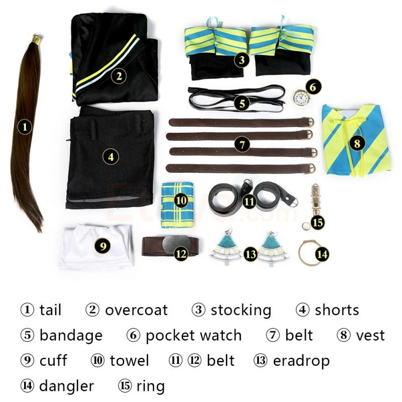 Full Set Including : Jacket, Shorts, Belt, Vest, Tail, Strap, Wristband, Earrings, Ring, Square Scarf, Pocket Watch, Other Props.