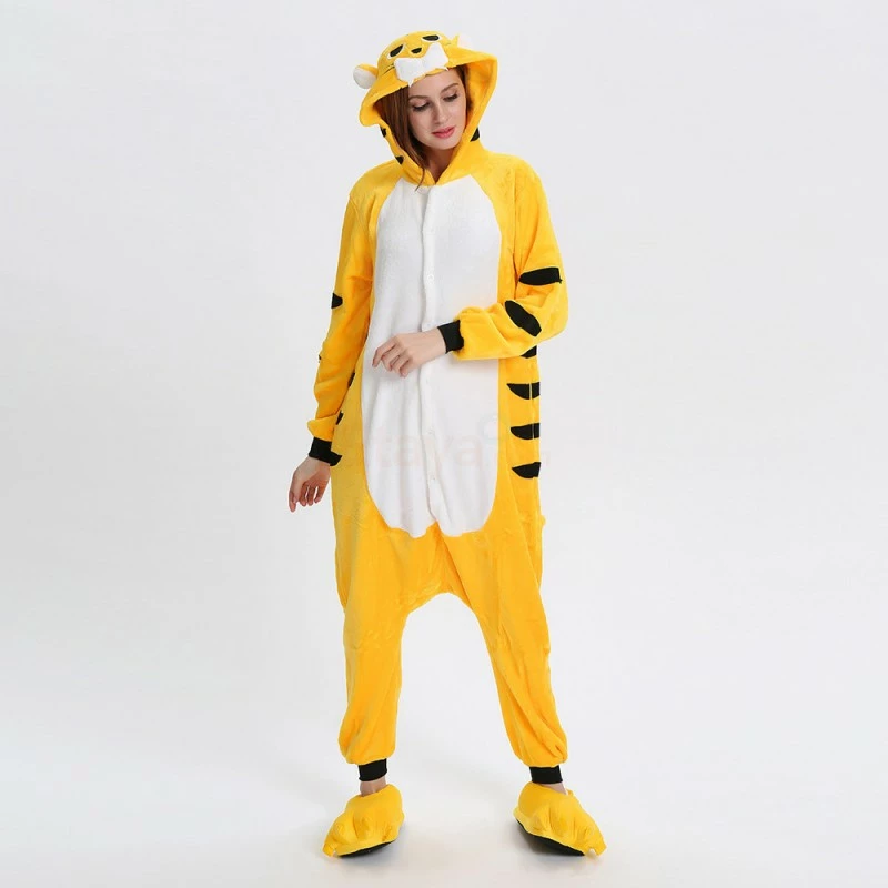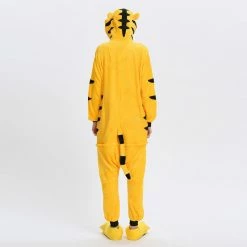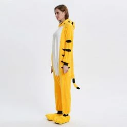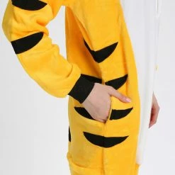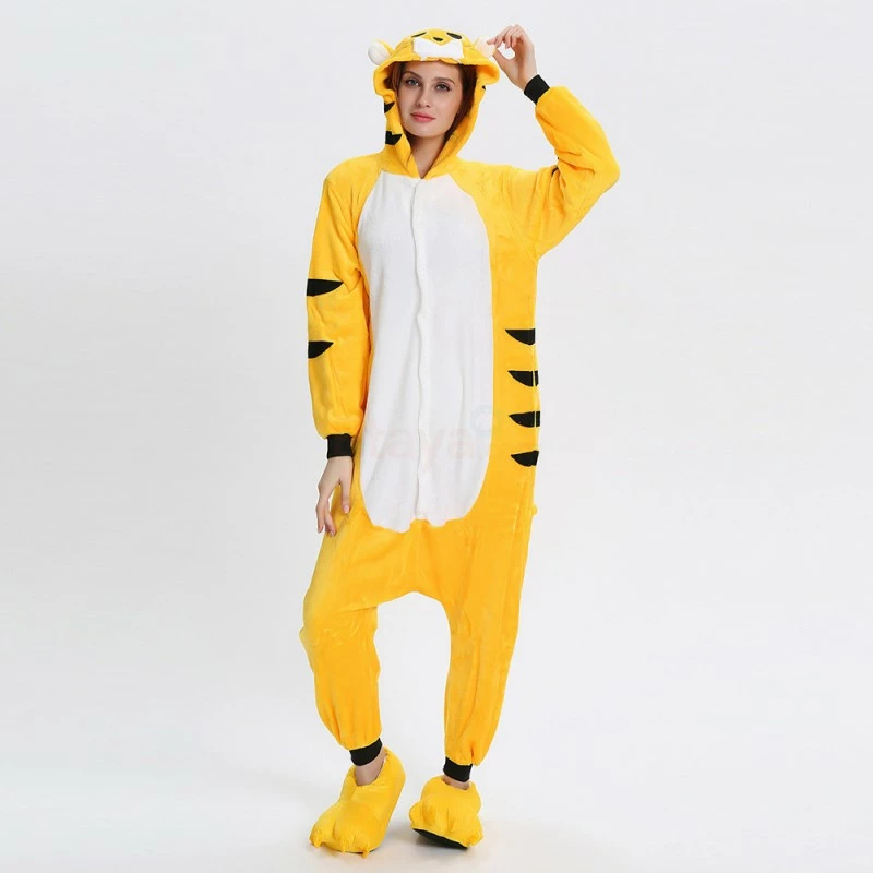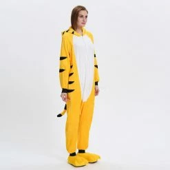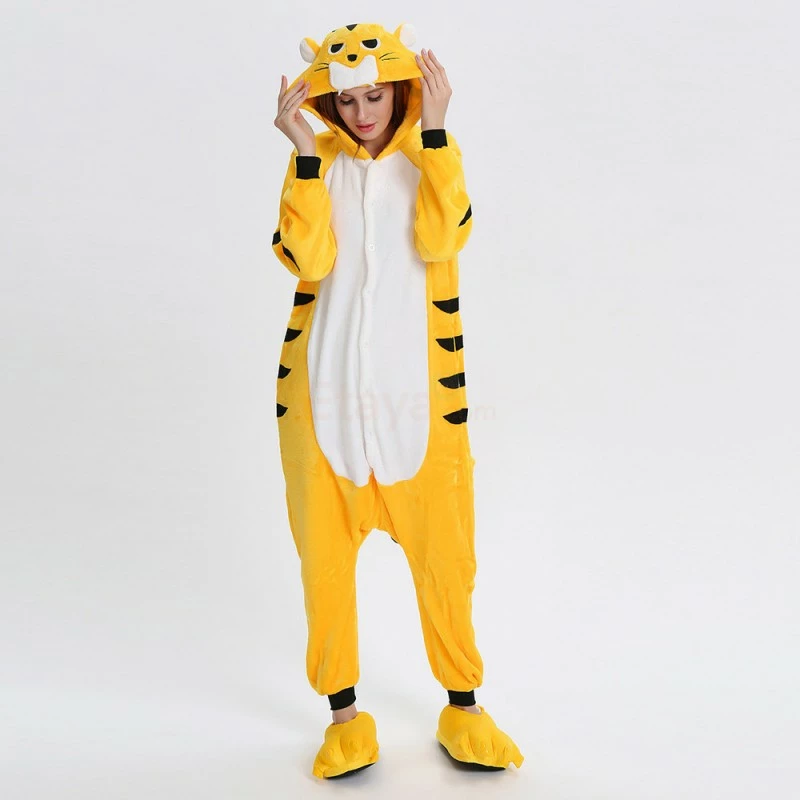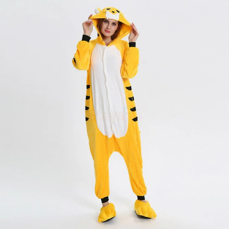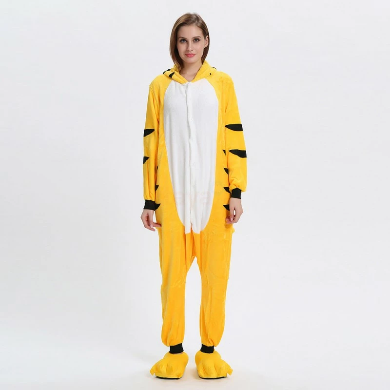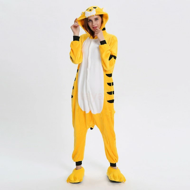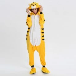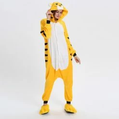 The tiger most recognizable for its pattern of dark vertical stripes on reddish-orange fur with a lighter underside. The tiger is among the most recognisable and popular of the world’s charismatic megafauna. The Yellow Tiger Kigurumi is made with high-quality fabrics and craftsmanship, and it is very comfortable to wear. Stand out on your adventures when you wear this Fierce Yellow Tiger Kigurumi!