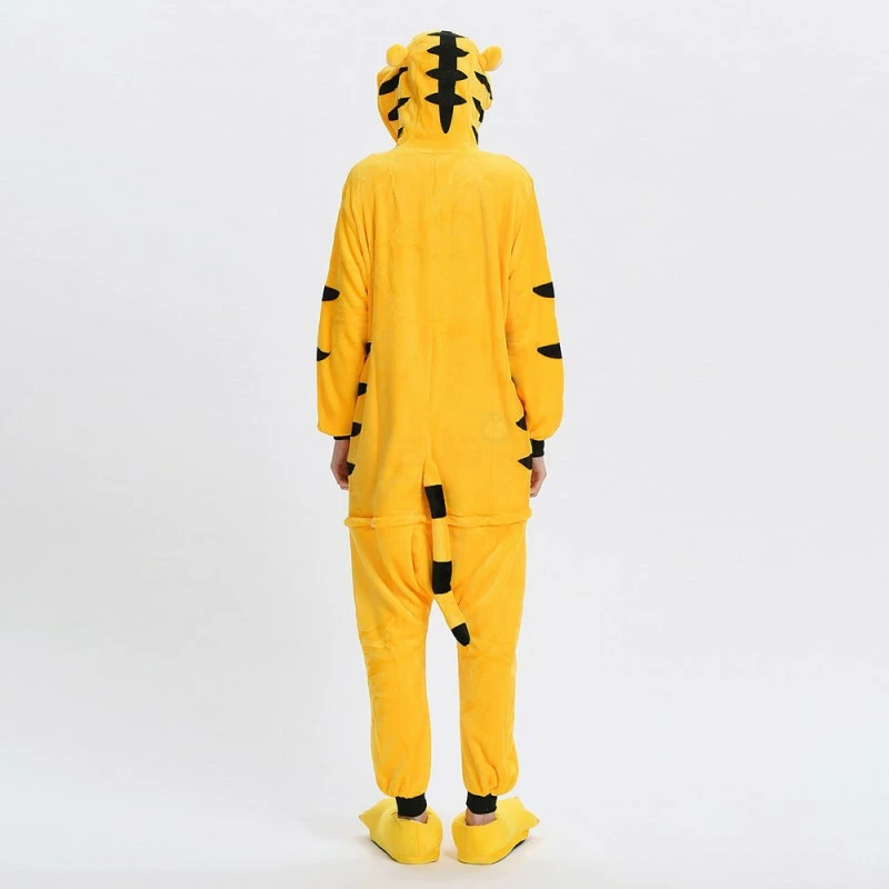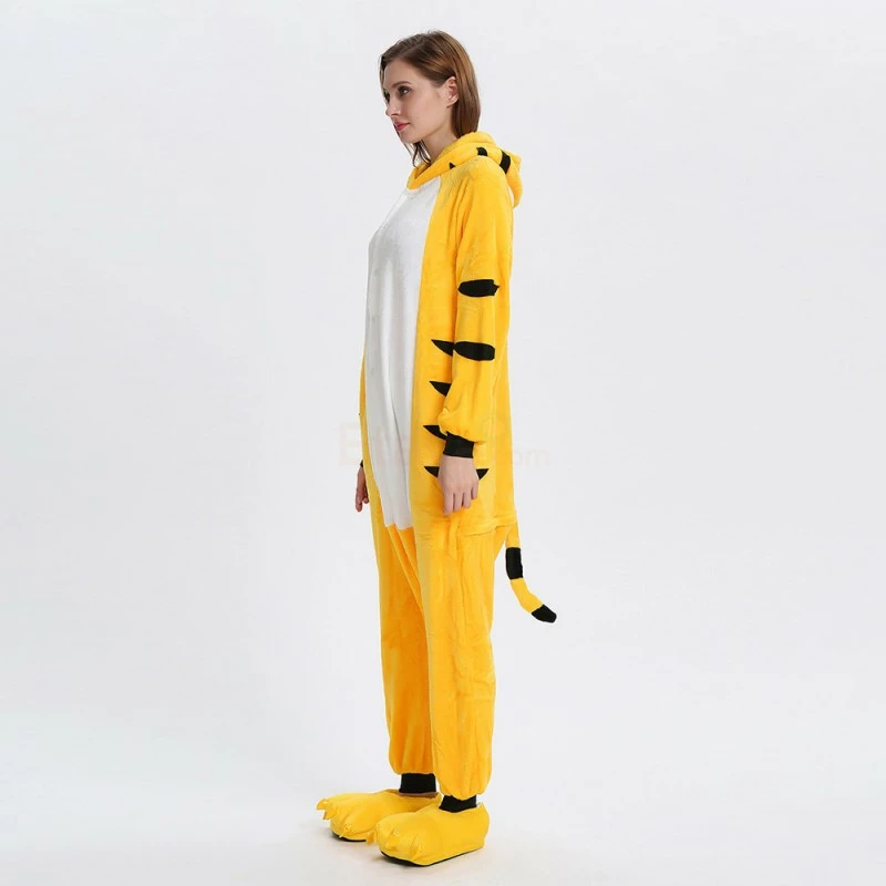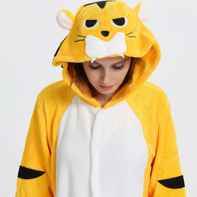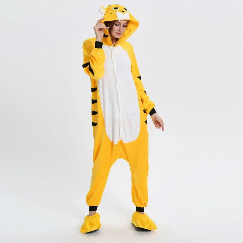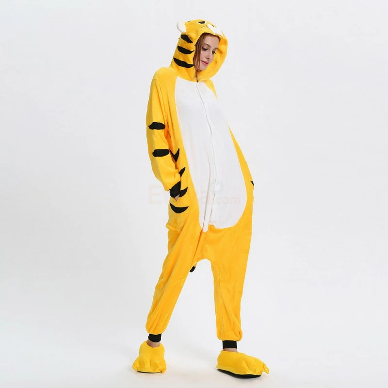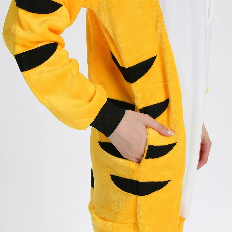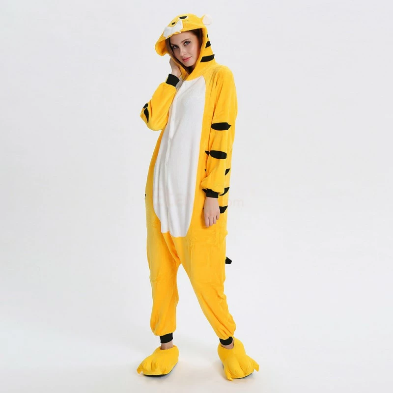 The tiger most recognizable for its pattern of dark vertical stripes on reddish-orange fur with a lighter underside. The tiger is among the most recognisable and popular of the world’s charismatic megafauna. The Yellow Tiger Kigurumi is made with high-quality fabrics and craftsmanship, and it is very comfortable to wear. Stand out on your adventures when you wear this Fierce Yellow Tiger Kigurumi!